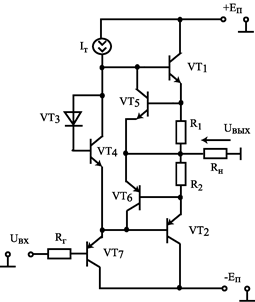 задает ток через VT3, VT4 и эмиттерный повторитель VT7. В схему встроена защита от короткого замыкания на выходе: