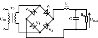 , через диод V3 в отрицательную трансформатор. При отрицательном напряжении открыты диоды V2 и V4, а диоды V1 и V3 закрыты. Ток течет от трансформатора через V2, индуктивность L, через емкостно-резистивную нагрузку C и