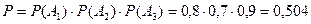 Пример 2.5. Вероятность попадания в цель для I-го стрелка равна 0,8, для II-го – 0,7, для III-го – 0,9. Каждый из стрелков делает по одному выстрелу. Найти вероятность того, что в мишени 3 попадания.