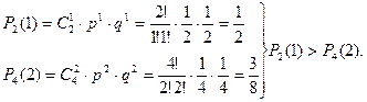 Пример 3.1. Два равносильных игрока играют в шахматы. Что вероятнее выиграть 1 раз из 2-х партий или 2 раза из 4-х?