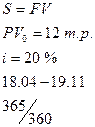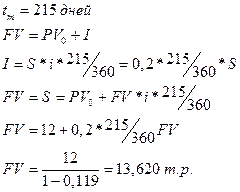Предприниматель 18.04 обратился в банк за ссудой до 19.11 того же года под простую ставку 20 % годовых. Банк, удержав в момент предоставления суммы проценты за весь ее срок, выдал предпринимателю 12 т.р. Какую сумму необходимо будет вернуть банку, если при расчете использовалась схема