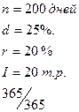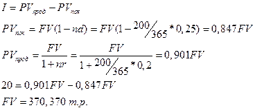 Банк за 200 дней до срока учел вексель по учетной ставке 25 % годовых и в тот же день продал этот вексель другому банку по процентной ставке 20 % годовых с точными процентами. В результате операции первый банк получил доход 20 т.р. Определить номинальную стоимость векселя в невисокосном году.