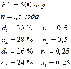 В банк предъявлен вексель на 500 т.р. за полтора года до срока погашения. Банк согласен учесть этот вексель по переменной учетной ставке: первые полгода ставка 30 % годовых, следующие полгода – 28 % годовых, затем каждый квартал ставка понижается на 2 %. Определите дисконт банка и сумму, которую получит векселедержатель.