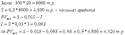 В банк 12.04 обратился клиент с целью получения кредита под залог 300 ценных бумаг на 3 месяца. Банк под 3 % ежемесячно согласился выдать кредит в размере 80 % от курсовой стоимости ценных бумаг. При этом сразу удерживались проценты по кредиту и комиссионные составляющие 1 % от номинала кредита. Курсовая стоимость одной ценной бумаги на 12.04 составила 20 т.р. Найти сумму полученную клиентом.