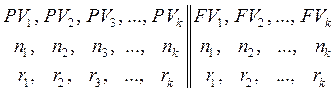 второй - выдано также k-кредитов одному заемщику на сроки n1, n2, n3…nk, но с одновременным удержанием процентов по кредиту, т.е. под ставки d1, d2, d3…dk.