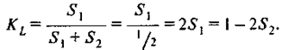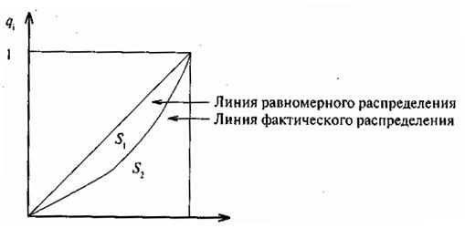 Для графической иллюстрации степени неравномерности в распределении доходов строится кривая Лоренца (см. рисунок), по которой также можно рассчитать коэффициент Джини как отношение площади между линиями равномерного и фактического распределения к сумме площадей S1и S2, которая равна ½: