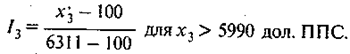 Если х3 £ x*3, то при расчете индекса реального объема ВВП (I3) берется фактическое значение этого показателя. Минимальное значение реального объема ВВП в расчете надушу населения принимается равным 100 дол. ППС, а максимальное дисконтированное значение составляет 6311 дол. США (ППС в дол. США).