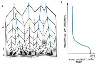 При дальнейшем росте эти зерна, стремясь принять свою равновесную форму, развиваются быстрее и не оставляют пространства для развития соседних зерен. В результате по мере утолщения осадка число зерен в сечении, параллельном подложке, уменьшается, а размер их увеличивается. Такая картина развития поликристаллического осадка получила название геометрического отбора, его графическая схема показана на рис.4.7.