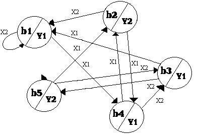 Отсюда имеем множества A b состояний автомата Мура A b = { b 1, b 2, b 3, b 4, b 5}. Для нахождения функции выходов l b с каждым состоянием, представляющим собой пару вида (a i, y g), отождествим выходной сигнал, являющийся вторым элементом этой пары. В результате имеем: