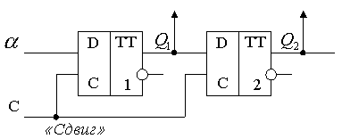 Аналогично строится и n-разрядный регистр сдвига, который содержит n последовательно соединенных D -триггеров, причем вход первого триггера является входом регистра.