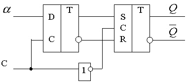 Регистр работает следующим образом. В момент поступления синхроимпульсов (т.е. в момент С =1) во второй D -триггер записывается информация, хранящаяся в первом триггере, а в первый триггер записывается очередной разряд числа, поступающего на вход регистра. При С =0 записанная информация появляется на выходе триггеров. Двухступенчатый D -триггер имеет вид: