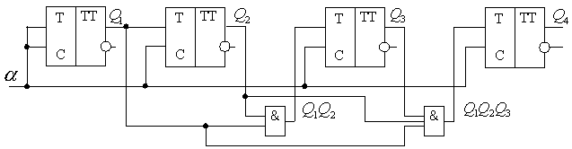 . Здесь Δ t - время задержки сигнала коньюнктором. Разрядность счетчика с параллельным переносом ограничивается возможностями логических элементов: коэффициентом разветвления и коэффициентом объединения. Поэтому иногда бывает целесообразно строить менее быстродействующую схему, но с использованием только двухвходовых логических элементов. При синтезе такого счетчика достаточно переписать функции возбуждения, полученные ранее, в виде T1=a; T2=Q1T1; T3=T2Q2; T4=T3Q3; … Tn=Tn-1Qn-1 или T1=1; T2=Q1; T3=T2Q2; T4=T3Q3;