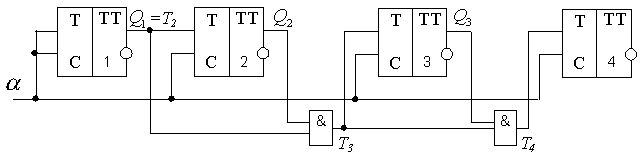 Существует еще один тип счетчиков с так называемым групповым переносом. Эти счетчики занимают по быстродействию и количеству оборудования промежуточное место между счетчиками с одновременным и сквозным переносом и используются в случае, когда число разрядов велико. В таких случаях счетчик разбивается на группы разрядов, в пределах каждой из которых строят цепи одновременного переноса. Перенос между группами реализуется обычно методом сквозного переноса. Рассмотрим процесс построения такого счетчика. Пусть n разрядов счетчика делятся на группы по k разрядов. Введем обозначения Tl гр – перенос на вход l -ой группы