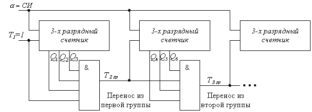 Т.е. в этой схеме каждый из трехразрядных счетчиков с одновременным переносом может быть выполнен не только на Т -триггерах, но и на других типах триггеров, например на JK -триггерах со сложной входной логикой. Здесь группы входов по J и K связаны внутри каждой из групп по И, т.е.