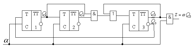 Аналогичным образом может быть синтезирован вычитающий и реверсивный счетчики с различными коэффициентами пересчета. При синтезе реверсивного счетчика появится дополнительный входной сигнал y, управляющий режимом работы счетчика. При сигнале y=0 синтезируем суммирующий счетчик, а при y=1 – вычитающий. Кодированную таблицу переходов строим одну. Студенты синтезируют вычитающий счетчик с коэффициентом пересчета, равным 9, и реверсивный счетчик с коэффициентом пересчета, равным 7 при сложении и вичитании.