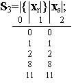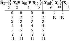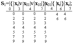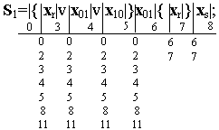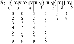При составлении таблицы следует учитывать, что для разных регулярных выражений автомат под действием одних и тех же входных сигналов переходит в разные состояния. Эти внутренние состояния будем отмечать множеством индексов основных мест. Например. В событии S 3 переход из состояния 0 в состояние 1 происходит под действием сигнала x r а в S 1 под действием этого же сигнала из состояния 0 автомат переходит в состояние 3. Поэтому, внутреннее состояние, в которое автомат переходит под действием xr из состояния 0, будем обозначать множеством из двух индексов 1 v 3. Аналогично получается переход из состояний 2, 7 и 9 под действием x r, а также переход из состояния 4 и 5 в состояния 3 v 6 и 3 v 8 соответственно под действием x r. При заполнении таблицы получается свободные клетки там, где переходы в автомате не определенны. Такие клетки будем отмечать звездочкой *, которую следует рассматривать как индекс некоторого внутреннего состояния. Таблица переходов составляется не только для состояний, отмеченных индексами основных мест регулярного выражения, но и для состояний, отмеченных множеством индексов. Для заполнения колонок для таких состояний достаточно образовать дизъюнкцию таких индексов, которые расположены в колонках, отмеченных индексами, входящими в множества. Например. Для заполнения колонки 1 v 3 образуем дизъюнкцию индексов расположенных в колонках 1 и 3. Поскольку состояния 1, 3, 6 и 8 отмечены пустой буквой e, то и состояния 1 v 3, 3 v 6, 3 v 8 также отмечаются буквой е.