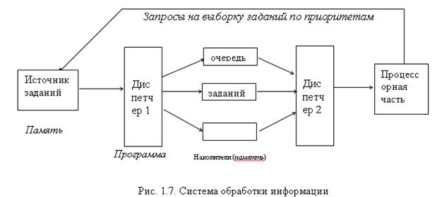 Задания формируются в источнике заданий (в памяти компьютера), откуда по запросам процессорной части системы они выбираются на обработку. Последовательность запросов к заданиям определяется приоритетами заданий и взаимозависимостью заданий, которая показывает, как результаты одного задания используются в других заданиях. Следовательно, в процессорной части системы реализуется граф обработки информации. За правильностью движения по такому графу следит система диспетчирования. Для оптимальной организации процесса диспетчирования в систему вводятся накопители. Схема обработки информации показана на рис.1.7.