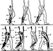 <=Рис. Степень сокращения мышц туловища и нижней конечности в течение двойного шага при обычной ходьбе (по данным электромиографического анализа, произведенного B.C. Гурфинкелем в ЦНИИТе протезирования и протезостроения).
