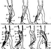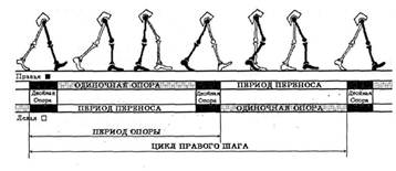 При ходьбе, как при других видах локомоторного движения, перемещение тела в пространстве происходит благодаря взаимодействию внутренних (сокращение мышц) и внешних сил - гравитация, сопротивление опорной поверхности и др. В каждом шаге, совершаемом правой и левой ногой, различают период опоры и период маха. Наиболее характерной особенностью всех видов ходьбы, по сравнению с бегом и прыжками, является постоянное опорное положение одной ноги (период одиночной опоры) или двух ног (период двойной опоры). Соотношение этих периодов обычно равно 4:1. Как период опоры, так и период маха, может быть разделён на две основные фазы, а именно: период опоры - на фазе переднего толчка и заднего толчка, разделённые моментом вертикали; маха - фазы заднего шага и переднего шага, между которыми также находится момент вертикали. [7]