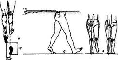 ^■Рис Ходьба в норме. Ширина и длина шага (а). Отклонение центра тяжести (ЦТ) во время ходьбы по вертикальной оси на 5 см (б). Отклонение ЦТ в сторону на 2^ см (в) (по S. Hoppenfeld,1983)