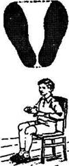 Рис. «В» Сидящий на стуле человек держит туловище вертикально, ОЦТ туловища находится внутри тела (близ позвоночника, примерно на 20см выше уровня пупка). Отвесная линия, проведенная из ОЦТ вниз, проходит через площадь опоры, ограниченную ступнями и ножками стула. В таком положении можно сидеть. Однако для того чтобы встать, человек должен перенести линию действия силы тяжести внутрь площади, ограниченной ступнями. Для этого необходимо наклонить туловище вперед и одновременно пододвинуть ноги назад (встать можно и, не меняя положения ног, если наклон вперед осуществить резко). [6]