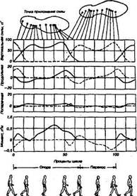 <=Рис. Изменение опорной реакции во время одиночного шага при ходьбе (по H.D. Eberhart, V. Inman, 1951; H.D. Eberhartetal, 1954)