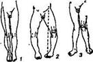 ФРис. Прохождение оси нижней конечности: 1 - нормальная ось; 2 - ось конечности проходит кнутри от надколенника; 3 - ось конечности проходит кнаружи от надколенника.
