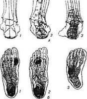 сустава. Стопа, также как колено, гасит ударные нагрузки во время движения. Нормальная стопа (на рисунке позиция «1») справляется с этим без проблем. Во всех остальных случаях (на рисунке позиции «2», «3») амортизация и, вместе с этим, накопление энергии проходят с затруднениями и, как правило, сопровождается быстрой утомляемостью голеностопа, и, также, влияют на курсовую устойчивость движения. Необходимо учитывать эти особенности, чтобы свести к минимуму диссипативные потери.