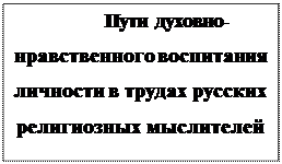 Этико-педагогическая тематика и, в частности, духовно-нравственное воспитание в большей мере нашли свое отражение в русской религиозной философии. Решение вопросов духовно-нравственного воспитания многие философы России XIX – XX веков связывали с понятием «соборность». В своих подходах к идеалам и путям воспитания они обращались к осмыслению и трансформации этого понятия, которое содержалось в Православном Символе Веры, переведенном Кириллом и Мефодием с греческого на славянский язык в IX веке. Постигшая в результате грехопадения человека раздробленность его внутреннего мира, полагали они, еще более углубленная западноевропейским рационализмом и индивидуализмом, может быть преодолена лишь путем приобщения личности к свободному единению людей – «соборности». Первое поколение русских религиозных мыслителей (К.С. Аксаков, И.В. Киреевский, А.С. Хомяков и др.) коренным началом духовной жизни русского народа считало православие и крестьянскую общину. Именно эти начала, по их мнению, определили некоторые характерные черты русской национальной культуры – направленность личности на то, чтобы осознать себя в общении с другими, проявляя соучастие и солидарность по отношению к ним.