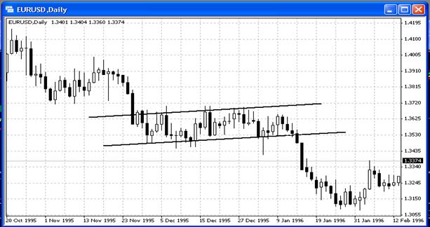 ФЛАГ обычно образуется в паузе между периодами сильного направленного движения на рынке. Формированию флага предшествует очень быстрое направленного движение, после которого цены входят в боковой коридор обычно с параллельными линиями уровнями поддержки и сопротивления, либо с легким наклоном в сторону обратную предыдущему движению.