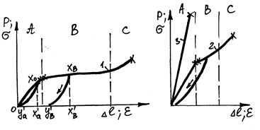 Вид диаграммы растяжения одного и того же волокна (нити) существенно зависит от их физическое состояния, что видно из рис.6. В застеклованном состоянии (ниже Тc) диаграмма приближается к прямой линии и характеризуется значительной величиной начального модуля деформации. В высокоэластическом состоянии (выше Тс) диаграмма имеет обычно три участка и характеризуется меньшей величиной начального модуля деформации.