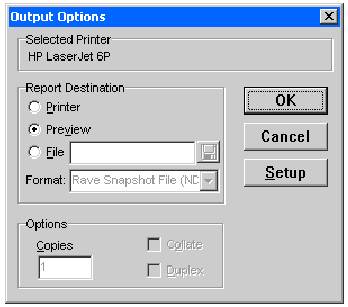 Начнем выполнение отчета. Когда появится диалог Output Options, радио кнопку выбора можно отметить. Нажатие OK продолжит выполнение в режиме просмотра.