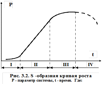 Вначале система развивается медленно (участок I), при достижении некоторого уровня развитие ускоряется (участок II) и после достижения некоторого более высокого уровня скорость роста уменьшается и в конечном итоге рост параметра системы прекращается (участок III), что означает появление в системе некоторых противоречий. Иногда параметры начинают уменьшаться (участок IV) - система "умирает".