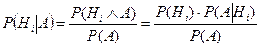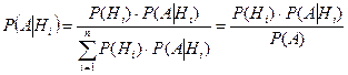 Если по результатам опыта можно сделать n исключающих друг друга предположений (гипотез) H1, H2, … Hn, представляющих полную группу несовместных событий (для которой Ʃi=1nP(i)=1, то вероятность события А, которое может появиться только с одной из этих гипотез, определяется: