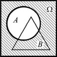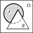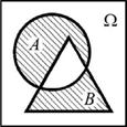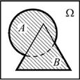 | Объединение множеств Aи B;множество точек, входящих хотя бы в одно из множеств Aили B | Событие, состоящее в том, что произошло или A, или B, или оба вместе |