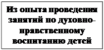 В муниципальном дошкольном образовательном учреждении № 398 г. Челябинска педагогом Т.Г. Феоктистовой проводятся занятия, направленные на духовно-нравственное воспитание дошкольников, в соответствии с разработанной программой [4][1]. Ее основными задачами являются: формирование элементарных нравственных представлений на основе ознакомления с их духовным значением (честь, семья, любовь, добро, совесть, верность и др.); воспитание положительного отношения к духовно-нравственным ценностям, желания поступать в соответствии с ними; обогащение опыта нравственного поведения детей на основе применения правила «поступай с другими так, как ты хотел бы, чтобы другие поступали с тобою»; формирование нравственных умений и привычек (умение справедливо оценивать поступки людей, быть послушными, вежливыми, со всеми приветливыми, доброжелательными и др.).