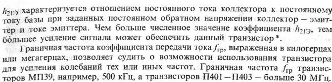 Частота, на которой |h21э| уменьшается в 0,707 раз по сравнению с его значением на низкой частоте, называется предельной частотой передачи тока базы fh21э. Частота, на которой |h21э| уменьшается до 1, называется граничной fгр (или f т). Частоты fh21э и fгр связаны между собой соотношением fгр = fh21э|h21э|.