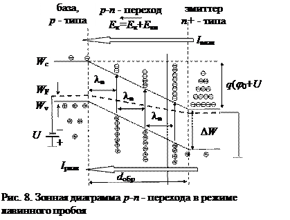 Лавинный пробой вызывается лавинным размножением носителей заряда под действием сильного электрического поля. При движении в сильном электрическом поле в p-n -переходе энергия электронов существенно превышает энергию теплового движения kТ. Если на длине свободного пробега электронов l n энергия электрона W = qЕln ³D W, где D W – энергия ионизации нейтрального атома кристаллической решетки, то при соударении атом ионизируется и электрон из валентной зоны переходит в зону проводимости, как показано на рис. 8. Дальше движутся уже два электрона, и при следующем соударении, возникает еще два свободных электрона. Процесс образования электронов носит лавинный характер. Следует отметить, что дырки движутся в базу и также могут ионизировать нейтральные атомы при столкновении.