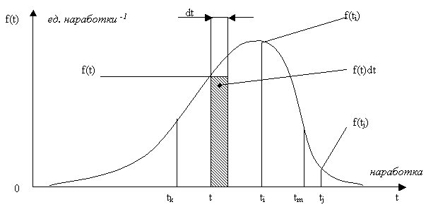 Отложим на оси абсцисс некоторую наработку t и бесконечно малый интервал наработки шириной dt, примыкающий к t.