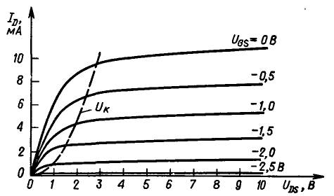 На рис. 3.3 представлены выходные характеристики полевого транзистора - графики зависимости между ID и UDS при различных фиксированных значениях UGS.
