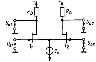 Для многих областей применения необходим дифференциальный усилитель с высоким входным сопротивлением. Типовая схема дифференциального усилителя, выполненного на полевых транзисторах, представлена на рис. 3.10.