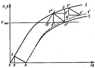 Нагрузочная характеристика при I = const может быть построена по треугольнику ВСА (рис. 14), полученному при токе I K= I. Если треугольник ВСА передвигать параллельно самому себе так, чтобы вершина С скользила по характеристике холостого хода, то точка А опишет нагрузочную характеристику (кривая