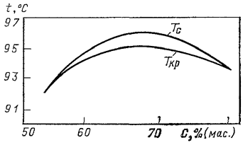 | Рис. 5. Диаграмма фазового состояния системы парафин–8-оксихинолин (по оси абсцисс отложена концентрация 8-оксихинолина): Т с — кривая температур начала помутнения гомогенного раствора; Т кр — кривая критических температур расслоения раствора на две микрофазы. |
