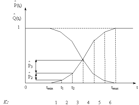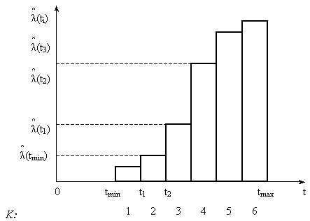 - разбить интервал наработки [tmin, tmax] на k интервалов равной ширины