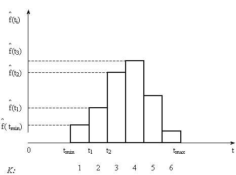 - полученный статистический ряд представляется в виде гистограммы, которая строится следующим образом. По оси абсцисс (t) откладываются интервалы Δt, на каждом из которых, как на основании, строится прямоугольник, высота которого пропорциональна (в выбранном масштабе) соответствующей частоте