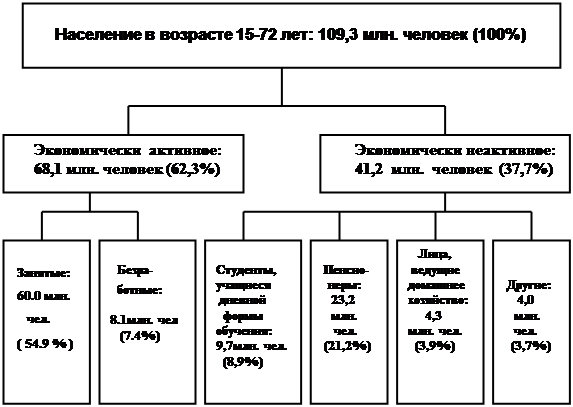 Численность занятых на производстве за годы реформ (1991-1997) снизилось на 8,2 млн. человек (см.: Экономика и жизнь.1998. №50. С. 1). Появился многочисленный и быстро растущий слой предпринимателей, в том числе индивидуальных предпринимателей. Частным бизнесом (типа “купи-продай”, в народе их называют “коробейники”) в нашей стране занимаются не менее 18 млн. человек. На все виды челночного бизнеса приходится 34 % товарооборота страны (см. там же. 1999. № 1. С. 29). Растет численность безработных и пенсионеров. Структура населения России в возрасте 15-72 года выглядит следующим образом (см. схему 1)*