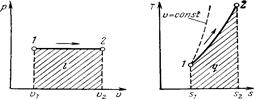 Изображение изохорного процесса в р,v – и Т, s – координатах.