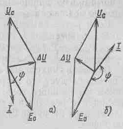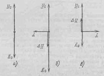 Предположим теперь, что ток возбуждения после синхронизации был увеличен и поэтому E>UC. Тогда возникает ток I [см. равенство (1)], отстающий от D U, а также от E и U на 900 (рис 7,б). Машина, таким образом, будет отдавать в сеть чисто индуктивный, ток и реактивную мощность. Если ток возбуждения уменьшить, так что E<UC, то ток I также будет отставать от D U на 900, но будет опережать E и U на 900, т. е. машина будет отдавать в сеть емкостный ток и потреблять из сети реактивную мощность (рис 7,в).