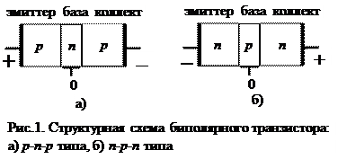 Основными элементами устройств, применяемых для усиления мощности электрических сигналов, являются транзисторы. Они выпускаются в виде отдельных элементов или входят в состав интегральных микросхем. Транзисторы можно разделить на два класса – биполярные и униполярные (полевые). В биполярных транзисторах в работе прибора принимают участие как положительные, так и отрицательные носители заряда, отсюда и термин “биполярный”. Биполярными транзисторами называют полупроводниковые приборы с двумя электрическими р-n - переходами и тремя выводами. Они состоят из чередующихся областей (слоев) полупроводника, имеющих электропроводности различных типов. В зависимости от типа электропроводности наружных слоев различают транзисторы р-n-р - типа и n-р-n - типа (рис.1).