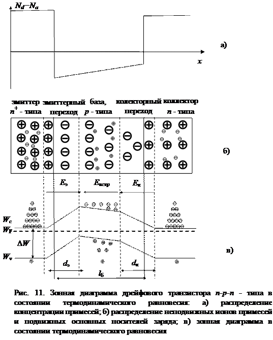 Для повышения быстродействия транзистора необходимо уменьшить время пролета носителей через базу t пр. Для этого в дополнение к диффузии носителей в базе необходимо использовать второй механизм переноса – дрейф носителей под действием электрического поля E встр. На рис.11,а показано распределение концентрации донорных Nd и акцепторных примесей Na. База транзистора легирована неравномерно, концентрация Na уменьшается от эмиттера к коллектору. На рис.11,б схематично показано распределение отрицательно заряженных ионов акцепторной примеси в базе. Со стороны коллекторного перехода их меньше, чем со стороны эмиттерного перехода, поэтому в базе возникает встроенное электрическое поле E встр (рис.11,б). Уровень дна зоны проводимости W c в базе имеет наклон.